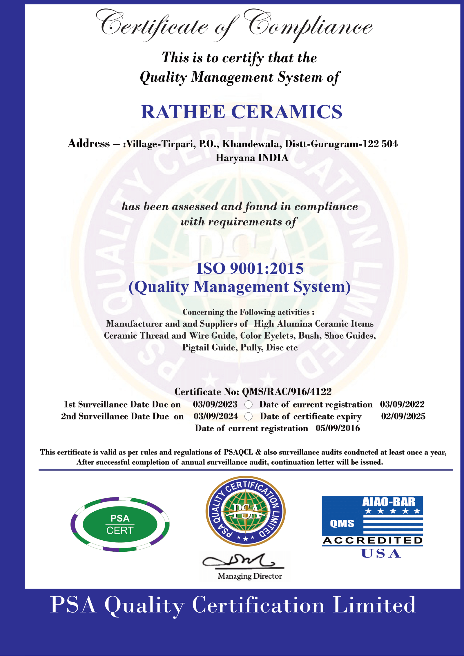 Incorporated in the year 2008, at Gurgaon (Haryana, India), Rathee Ceramics High Alumina Industries ,has gained recognition as the noteworthy Manufacturer, Supplier and Exporter of an exclusive gamut of Ceramic Thread and Wire Guides, Ceramic Guides, Ceramic Tubes and Rods, Ceramic Eyelets, Ceramic Pulley and many more.
